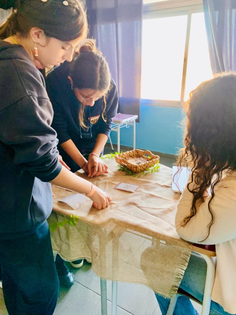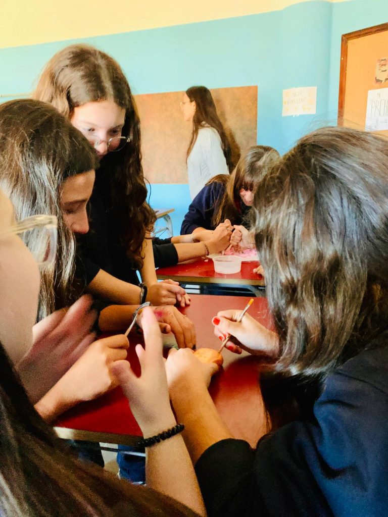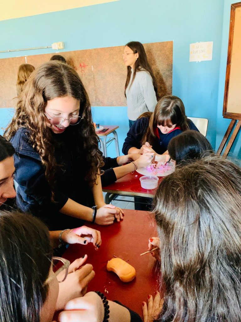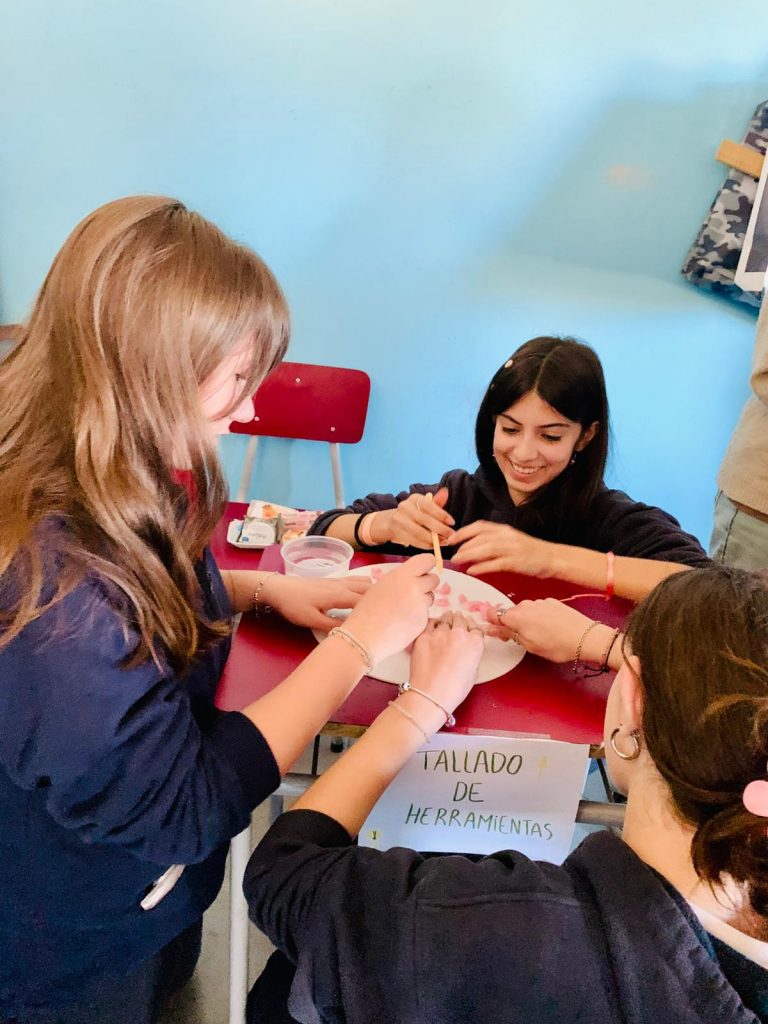 Las estudiantes del 2° EMS opción Artístico llevaron el museo al liceo y presentaron aspectos del arte y de la arquitectura de la Prehistoria, Mesopotamia y del Antiguo Egipto a estudiantes de 7°. A lo largo del recorrido por diferentes estaciones, estudiantes de 7° aprendieron técnicas de tallado y pintura prehistórica, escribieron en tablillas de arcilla, aprendieron elementos de la arquitectura mesopotámica a través de un juego de cartas, conocieron la historia de la figura de Nefertiti así como los detalles de la momificación y la vida después de la muerte entre los egipcios.